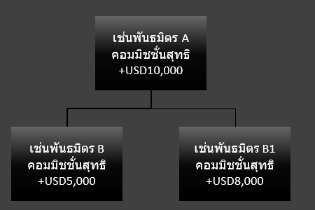 | รายได้ค่าคอมมิชชั่นทั้งหมดของพันธมิตร A คือ USD10,000 + (USD5,000 + USD8,000) * 5% = USD10,650 |